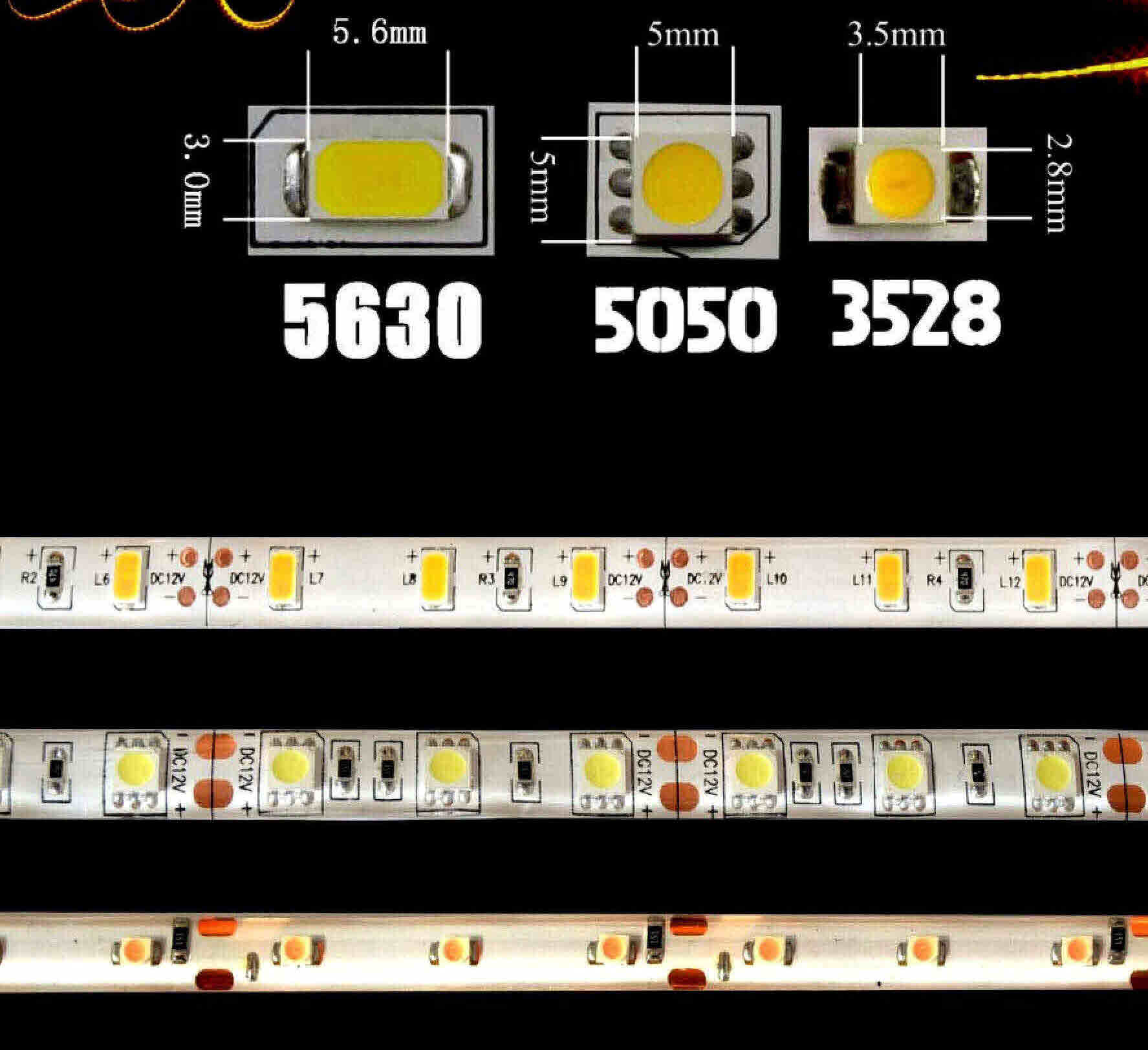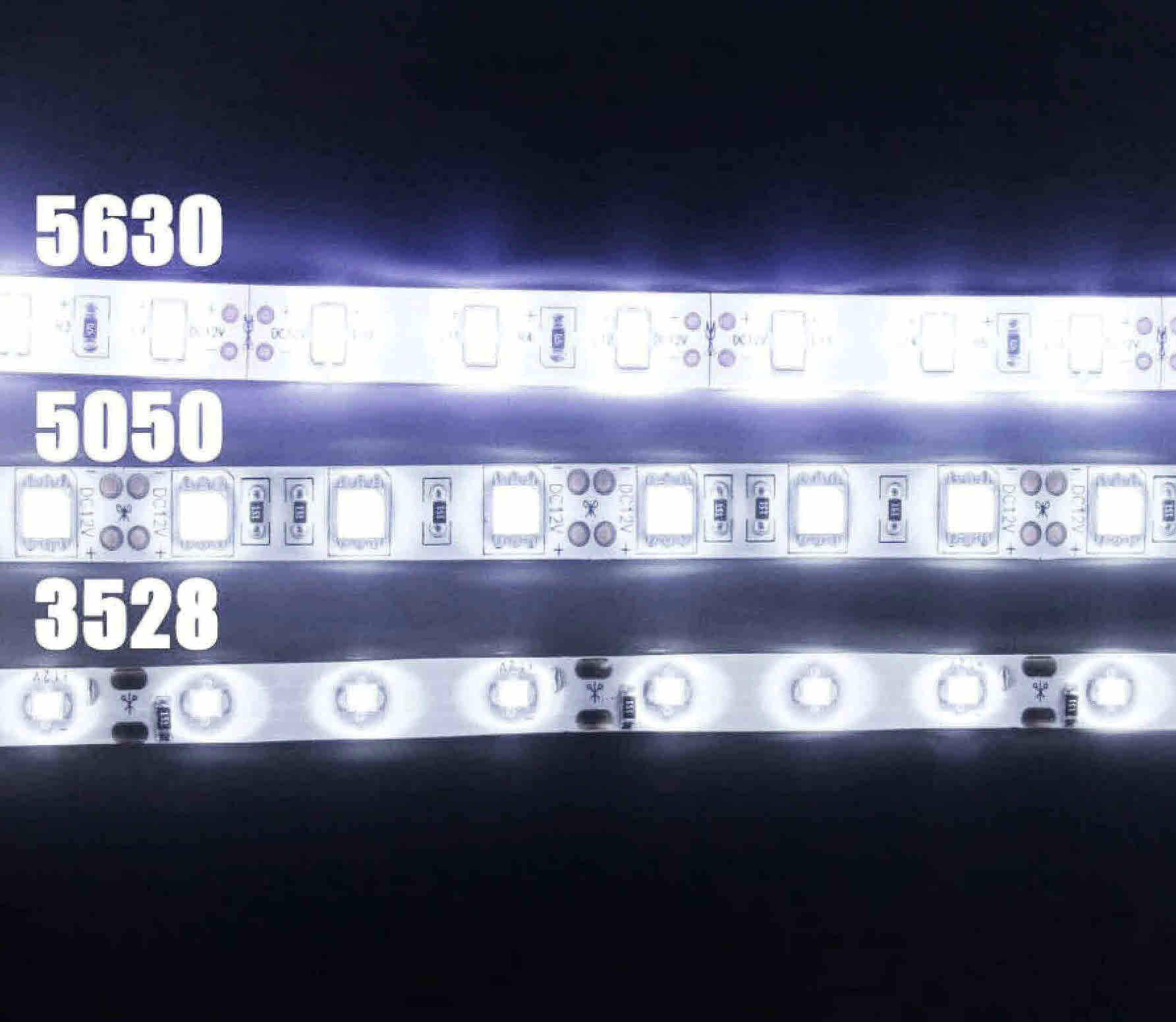 5630 LEDs are brighter than 5050 and 3528 LEDs 5630 LEDs are by far the brightest, but it is not due simply to a larger lighting surface. There are other factors that go into the output of an LED diode (measured in luminous flux/lumens). The reasons are to do with the design of the chip and the amount of power that they draw.